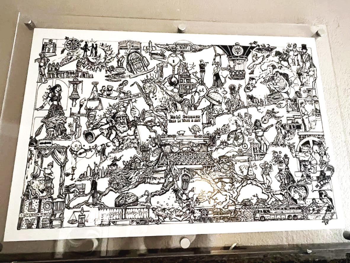 We’re launching This Is What I Saw with a three-night, no-repeat, acoustic gauntlet. One man, his trusted Martin D-35. 100 songs played stripped to their essence (clothing optional) my imaginings tended by yours and rendered by fine artist Pete Nogas. Pete had the idea to create who illustrated a pen andt 100 song poster and he did it. One day sitting in my living room I was struck that Pete captured me in a way that I’d never seen myself. The refection of my ambling and ramblings in one seen. So then and there I decided “I’m doing it” Recordings: that is. To be precise 100 songs over the course of five days in the redwoods of La Honda, a caffeine-fueled sprint that produced , a head-trip of a journey. Yes a few flubs but no overdubs, At the end of Novermber comes the kick off shows — a three nights residency at Fairfield Theatre Company, Nov 21–23. Together they’re a single story told verse by verse across — ink, sound, paper, and Michalob Ultra. It’s proof that after years of chasing songs, the songs boomarng back and start chasing you. It has to be the songs coming a lookin for me becaause they are definatley not coming for the Michelob Ultra.
